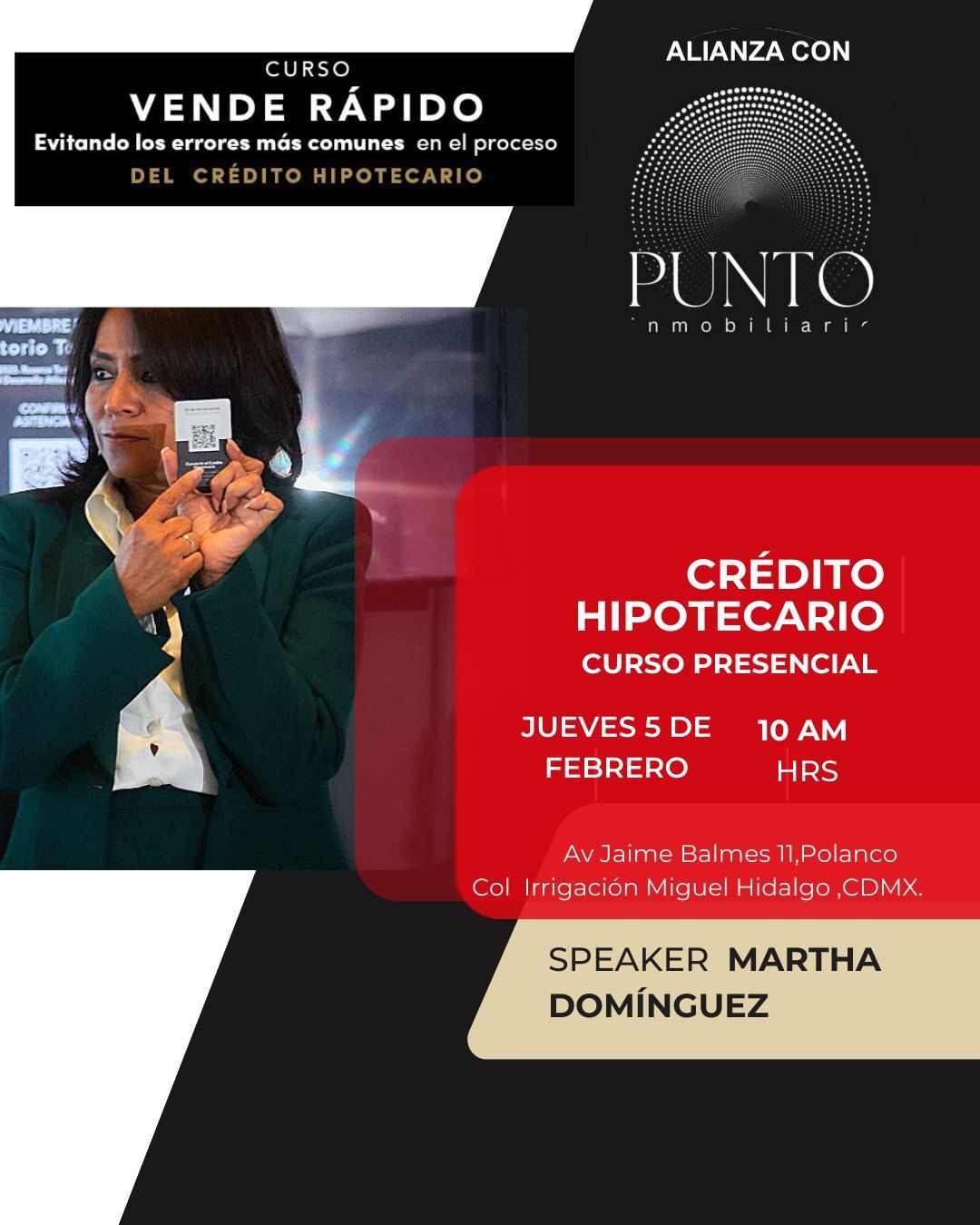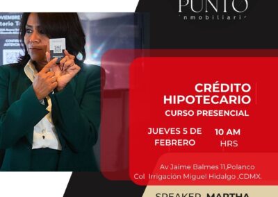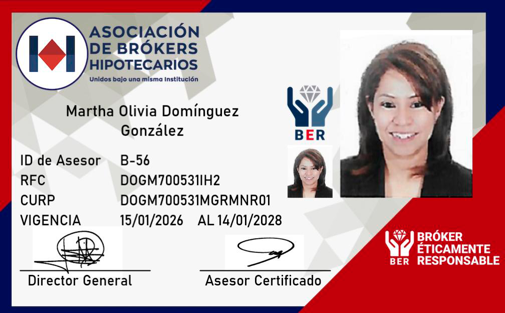 Martha Domínguez es broker hipotecario certificada, con certificación vigente desde 2019 hasta 2028, y asociada activa de la Asociación Mexicana de Profesionales Inmobiliarios (AMPI) desde 2019. Cuenta con más de 20 años de experiencia en el sector bancario y financiero, lo que le ha permitido desarrollar una visión estratégica, ética y orientada a resultados en la asesoría hipotecaria.