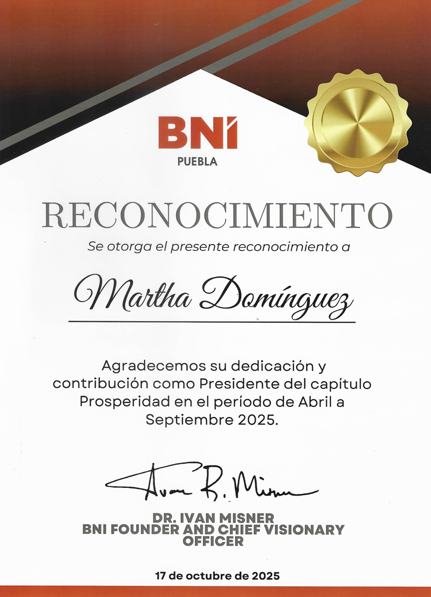 Desde 2022 participa activamente en BNI Prosperidad, donde fungió como Presidenta del capítulo de marzo a octubre de 2025. BNI (Business Network International) es una organización internacional de empresarios y profesionales de alto nivel, experiencia que consolidó su liderazgo, disciplina operativa y seguimiento de planes estratégicos.